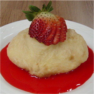 Hojaldre relleno de helado de vainilla, caoeado, bañado con jarabe de fresa o chocolate | ||